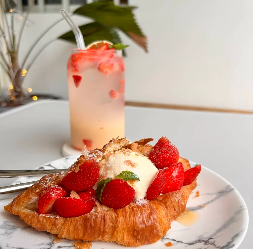 店內招牌的 「紅心芭樂美式」,選用宜蘭在地紅心芭樂,果香與咖啡苦韻取得完美平衡,清爽不膩,是許多第一次來訪的客人一喝就愛上的味道。